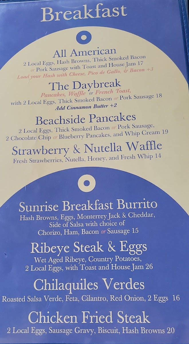 2 Local Eggs, Thick Smoked Bacon or Pork Sausage, 2 Chocolate Chip or Blueberry Pancakes, and Whip Cream | Add Sweet Cinnamon for an additional price.